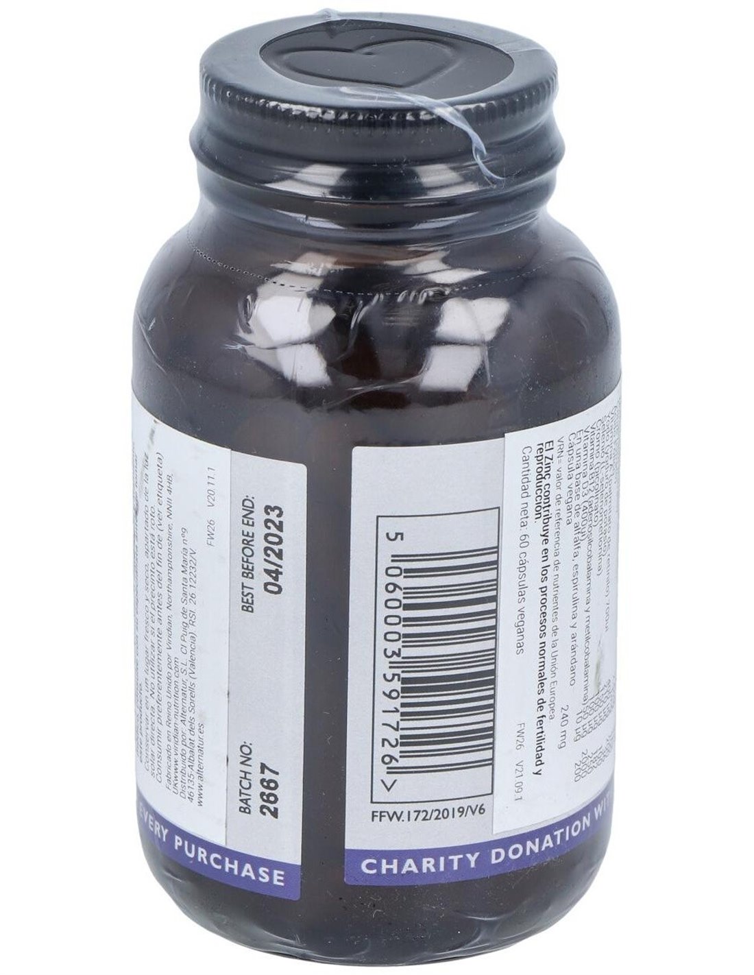 Vitamina C (ácido ascórbico) 100 mg, Vitamina E (d-alfa tocoferol natural) 100ui 67 mg, Ácido Alfa Lipoico 50 mg, DHA (ácido docosahexaenoico) 30 mg, Inositol 30 mg, Bioflavonoides Cítricos 20 mg, Zinc (picolinato) 15 mg, Hierro (bisglicinato) 10 mg, Vitamina B6 (piridoxal-5-fosfato) 5 mg, Manganeso (citrato) 2,5 mg, Cobre (citrato) 1 mg, Ácido Fólico 400 µg, Vitamina A (palmitato de retinilo) 700 ui 210 µg, Yodo (yoduro de potasio) 150 µg, Selenio (L-selenometionina) 100 µg, Cromo (picolinato) 100 µg, Vitamina B12 (adenosilcobalamina y metilcobalamina) 50 µg, Vitamina D3 (400ui) 10 µg. En una base de alfalfa, espirulina y arándano, Cápsula vegana 240 mg
