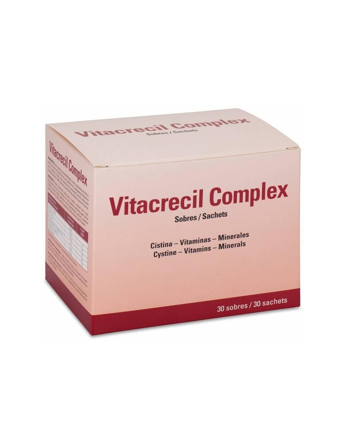 Vitacrecil Complex es un complemento alimenticio con una combinación equilibrada de elementos nutritivos para la nutrición de cabellos y uñas. Una ingesta adecuada de zinc es uno de los factores que ayudan a mantener el cabello y las uñas en\ condiciones normales. La biotina es una vitamina cuyo aporte dietético suficiente contribuye al normal mantenimiento del cabello. La cistina es un aminoácido azufrado constitutivo de la queratina. Apto para intolerantes a la lactosa.