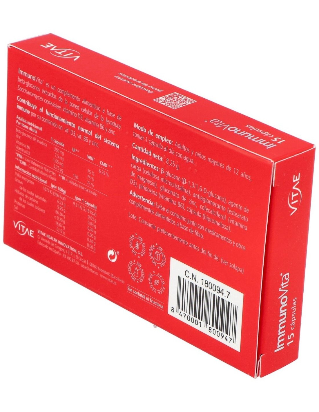Vitae Immunovita 15 cápsulas es un suplemento con betaglucanos purificados de la levadura Saccharomyces cerevisiae, vitamina D3, vitamina B6 y zinc. Contribuye al funcionamiento normal del sistema inmunitario, ayuda a disminuir el cansancio y la fatiga y protege las células frente al daño oxidativo. Indicado para adultos y niños mayores de 12 años.