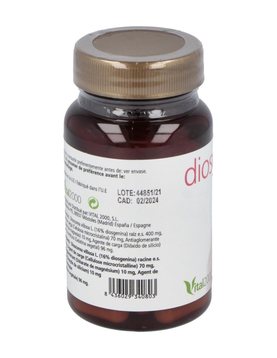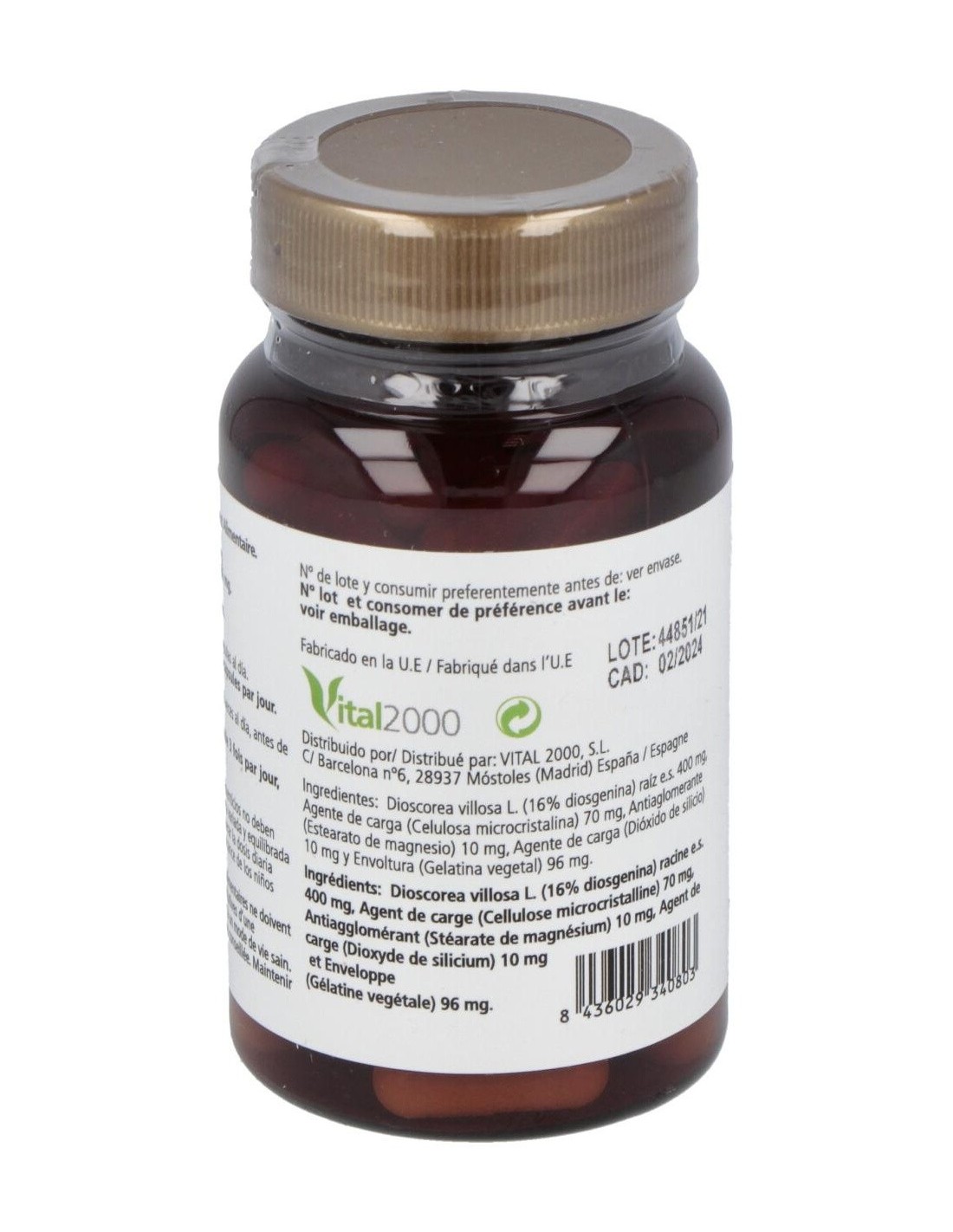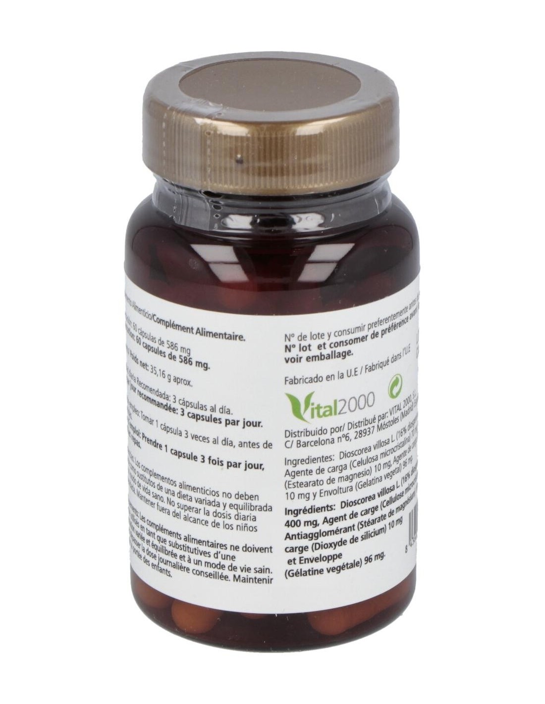 Ñame salvaje (Dioscorea villosa) e.s. 400 mg (con una riqueza del 16 % en diosgenina por lo que cada cápsula aporta 64 mg. de diosgenina).