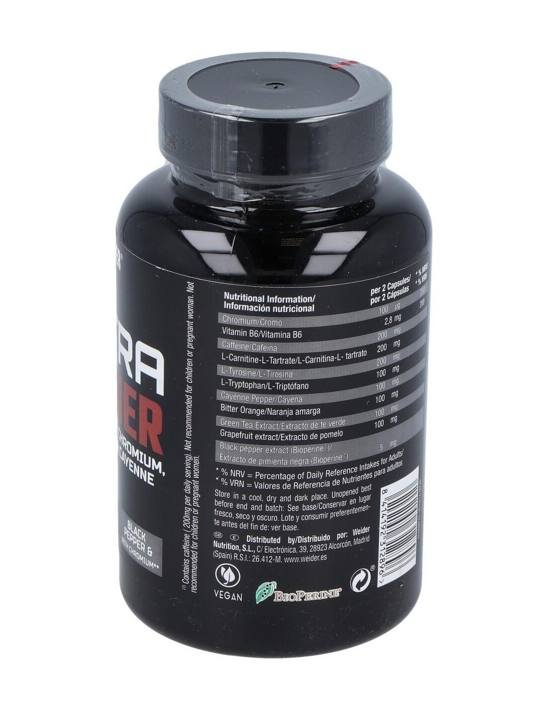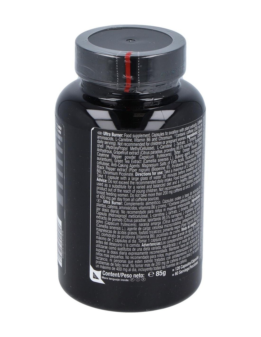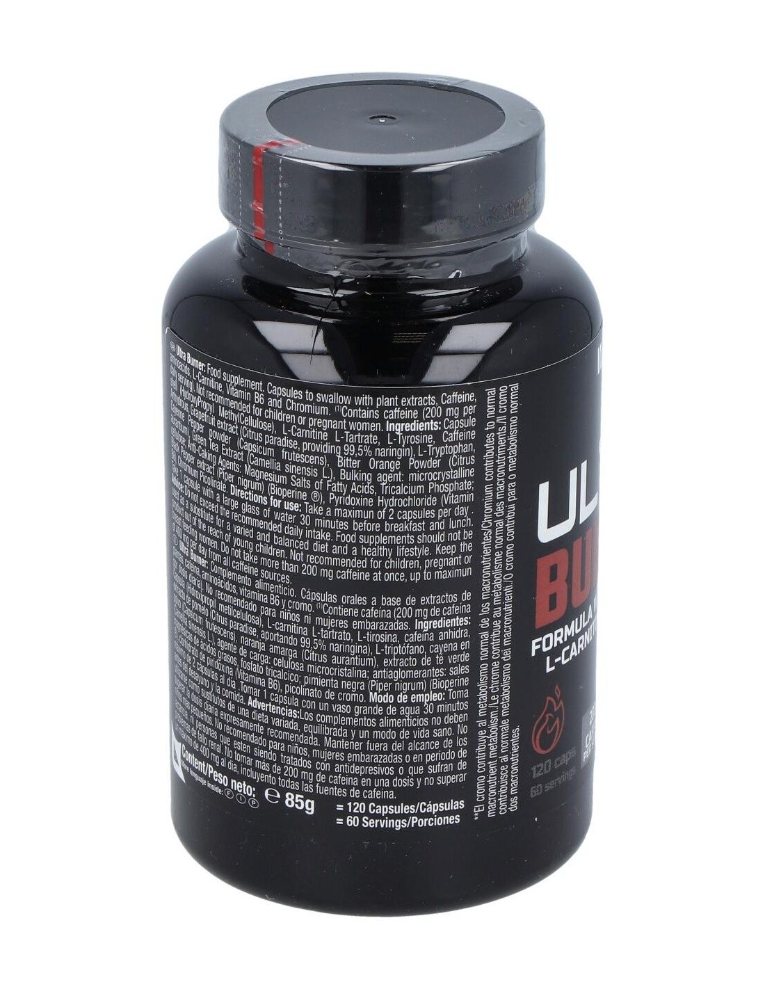 cápsula (Hidroxipropil metilcelulosa), L-carninina L-tartrato, cafeína anhidra, L-tirosina, L-triptófano, cayena en polvo (Capsicum frutescens), naranja amarga (Citrus aurantium), extracto de té verde (Camellia Sinensis L.), extracto de naringina (Citrus grandis), antiaglomerantes: dióxido de silicio, sales magnésicas de ácidos grasos; pimienta negra (Piper nigrum) (Bioperine®), clorhidrato de piridoxina (Vitamina B6), picolinato de cromo.