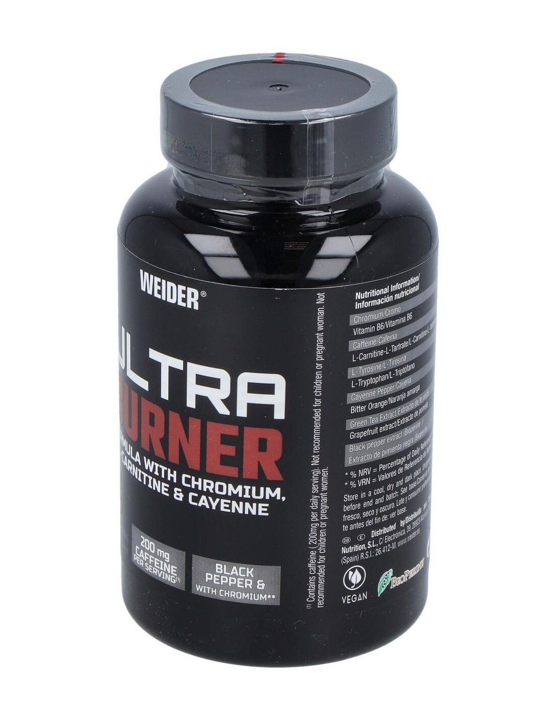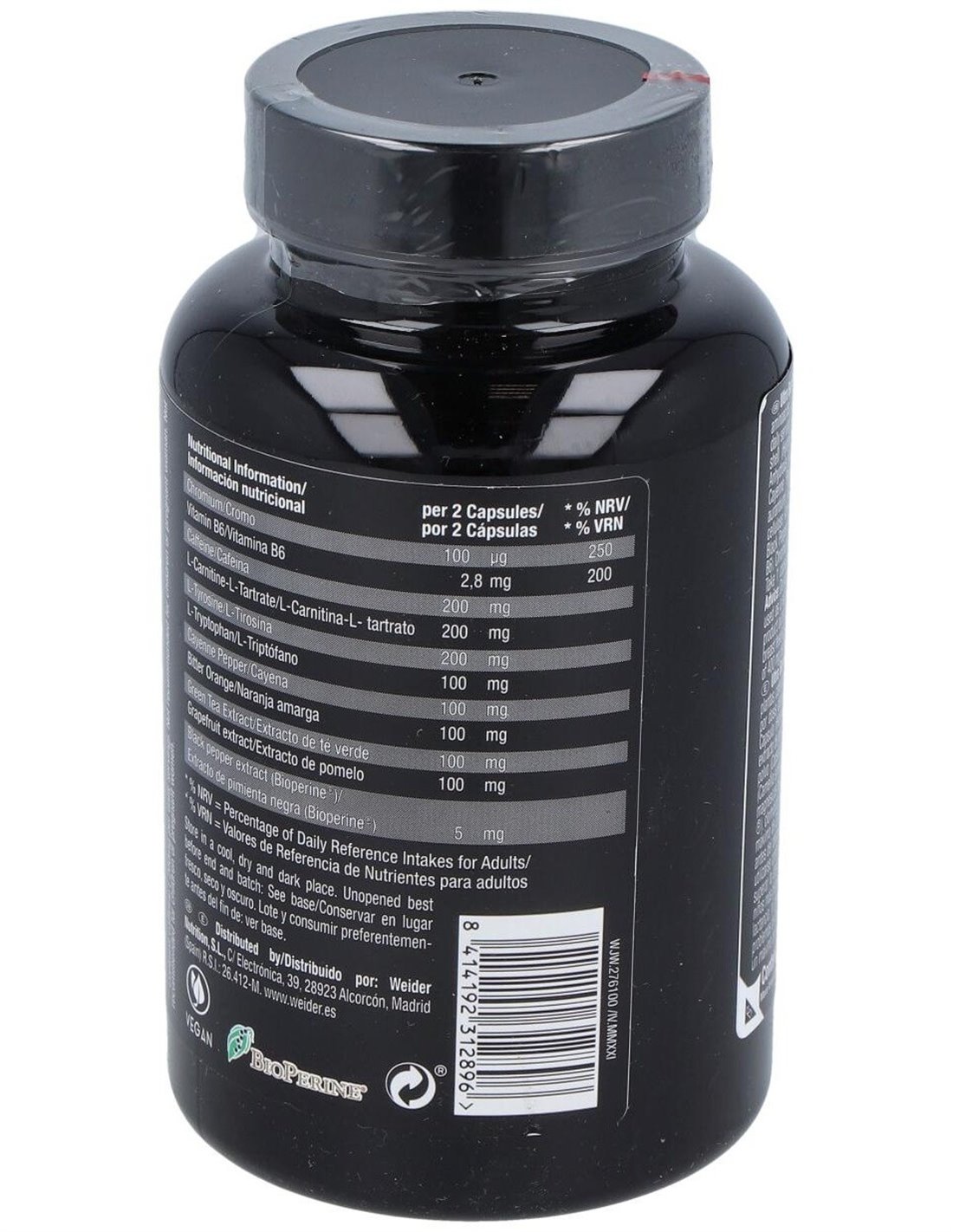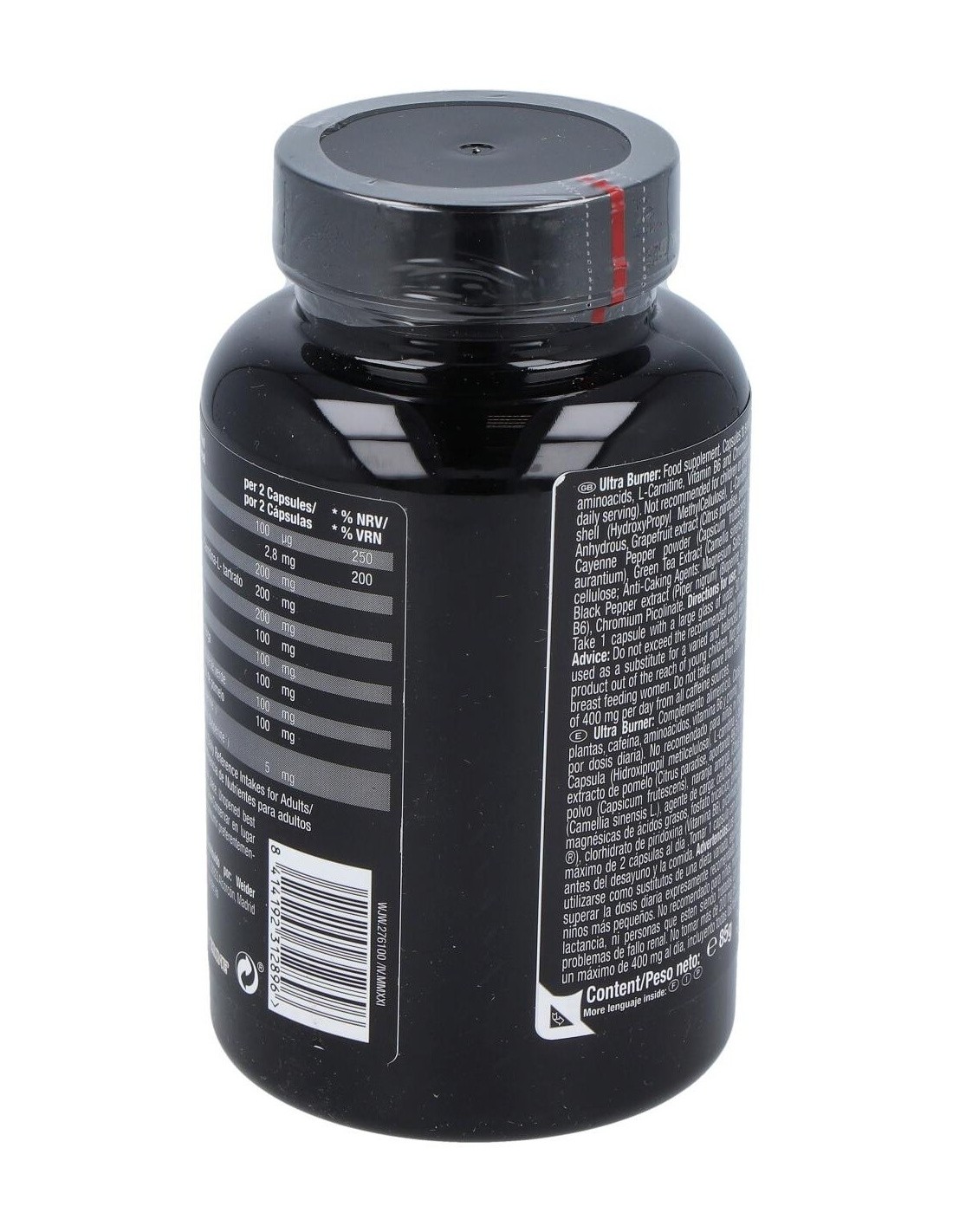 cápsula (Hidroxipropil metilcelulosa), L-carninina L-tartrato, cafeína anhidra, L-tirosina, L-triptófano, cayena en polvo (Capsicum frutescens), naranja amarga (Citrus aurantium), extracto de té verde (Camellia Sinensis L.), extracto de naringina (Citrus grandis), antiaglomerantes: dióxido de silicio, sales magnésicas de ácidos grasos; pimienta negra (Piper nigrum) (Bioperine®), clorhidrato de piridoxina (Vitamina B6), picolinato de cromo.