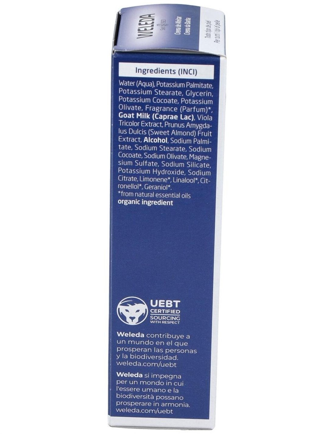 INCI: Water (Aqua), Potassium Stearate, Glycerin, Potassium Olivate, Potassium Cocoate, Sodium Stearate, Fragrance (Parfum)*, Viola Tricolor Extract, Prunus Amygdalus Dulcis (Sweet Almond) Fruit Extract, Goat Milk (Caprae Lac), Alcohol, Sodium Olivate, Sodium Cocoate, Sodium Silicate, Magnesium Sulfate, Limonene*, Linalool*, Citronellol*, Geraniol*.
