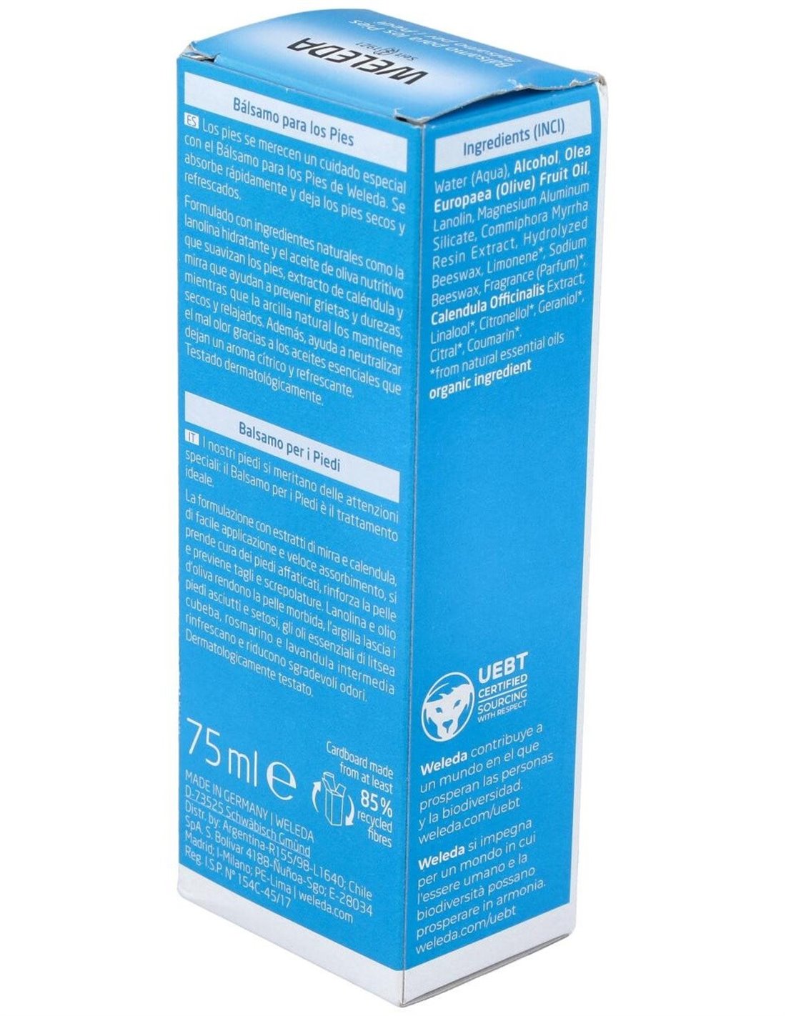 Crema de textura no grasa que alivia, suaviza y descansa los pies. Gracias a la acción de la caléndula y la mirra, calma y fortalece la piel y previene la formación de durezas. Con cera de lana y aceite de oliva, cuida y suaviza incluso los pies agredidos. Una ligera selección de aceites esenciales naturales aporta un efecto refrescante y desodorante. Deja la piel aterciopelada, con una agradable sensación de pies frescos y suaves. Certificado Natrue.