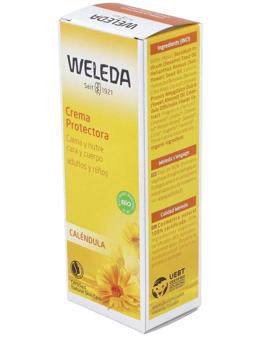 Cuidado esencial para toda la familia, para cara y cuerpo. De textura untuosa, esta crema une las virtudes nutritivas y protectoras del aceite de almendra dulce y de la cera de abeja con las virtudes calmantes de la caléndula bio. Previene el desecamiento cutáneo y protege todo tipo de piel de las agresiones externas y las condiciones climáticas desfavorables como el frío o el viento. Los extractos de caléndula alivian y calman la piel seca, sensible o irritada. Certificado NaTrue.