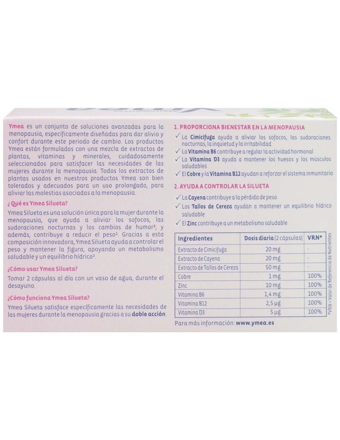 Ymea Menopausia Silueta 64 Cápsulas es un complemento diseñado para controlar el peso y reducir los síntomas de la menopausia a partir de ingredientes de origen vegetal.