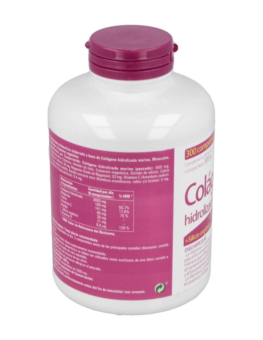 Complemento alimenticio que ayuda a combatir la formación el colágeno el organismo. El magnesio ayuda a aumentar la producción natural de colágeno en el organismo, interviniendo en el momento de mantener el correcto funcionamiento de los órganos y ayudando a activar nuestro sistema muscular a través de la producción de energía. Compuesto a base de colágeno hidrolizado marino, minerales, vitaminas y especies vegetales. Formato de 300 cápsulas.