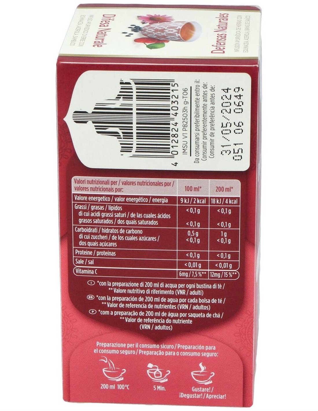 Equinácea*, rosa canina*, zumo de acerola deshidratado*, albahaca*, canela*, jengibre*, cardamomo*, bayas de saúco*, pimienta negra*, moringa*, hibisco*, cáscara de cacao*, regaliz*, hinojo*